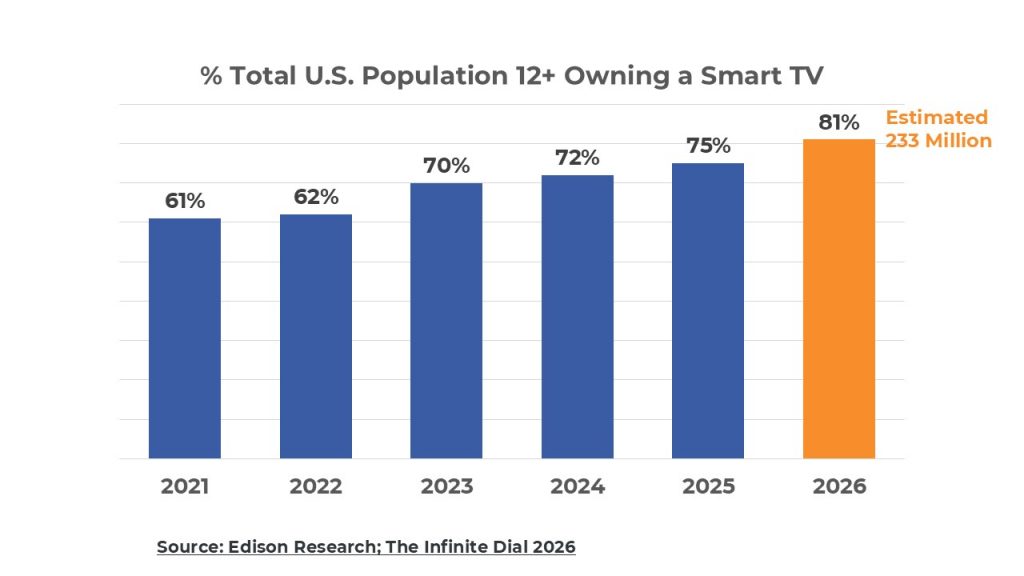 Smart TVs continue to penetrate American households. This year, 81% of those surveyed by Edison Research said they own one, an increase from last year’s 75%. And they aren’t just buying them, they’re using them. Parks Associates recently found that for 61%, the smart TV is their primary device for streaming video. External media players like Apple TV and USB sticks are a distant second at 30%. Both of these findings are significant, as smart TV home screens increasingly influence what audiences choose to watch. (Edison Research: March 12, 2026)